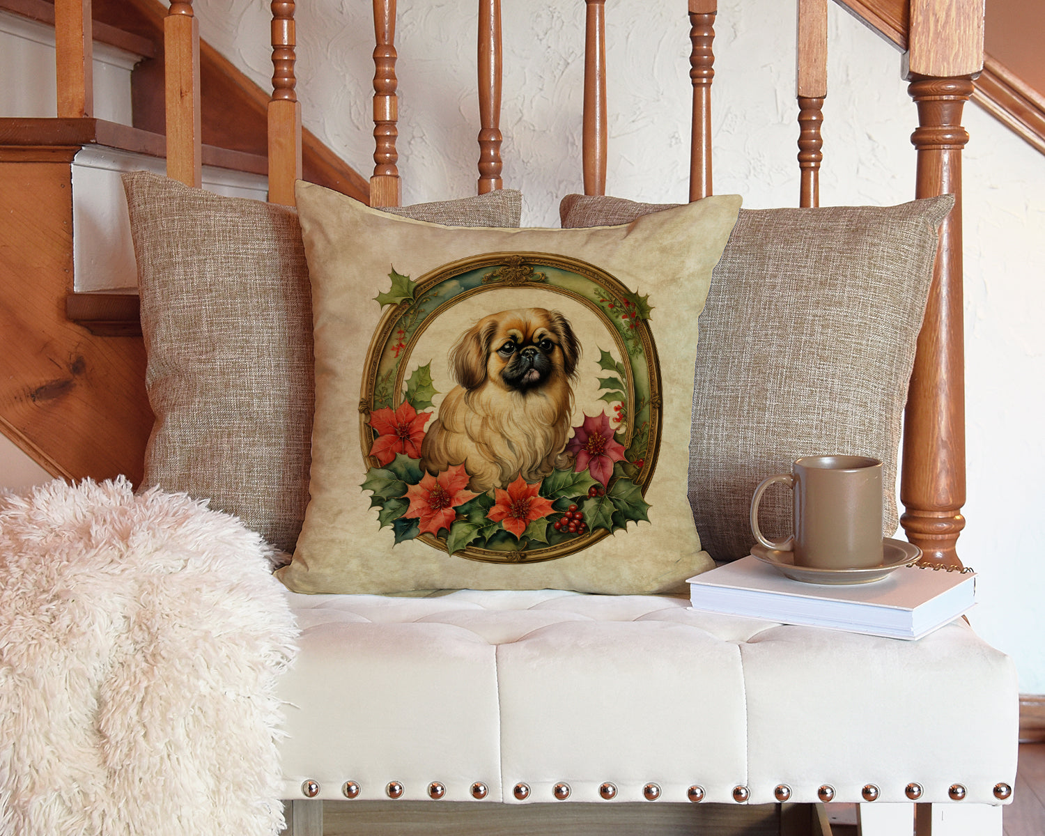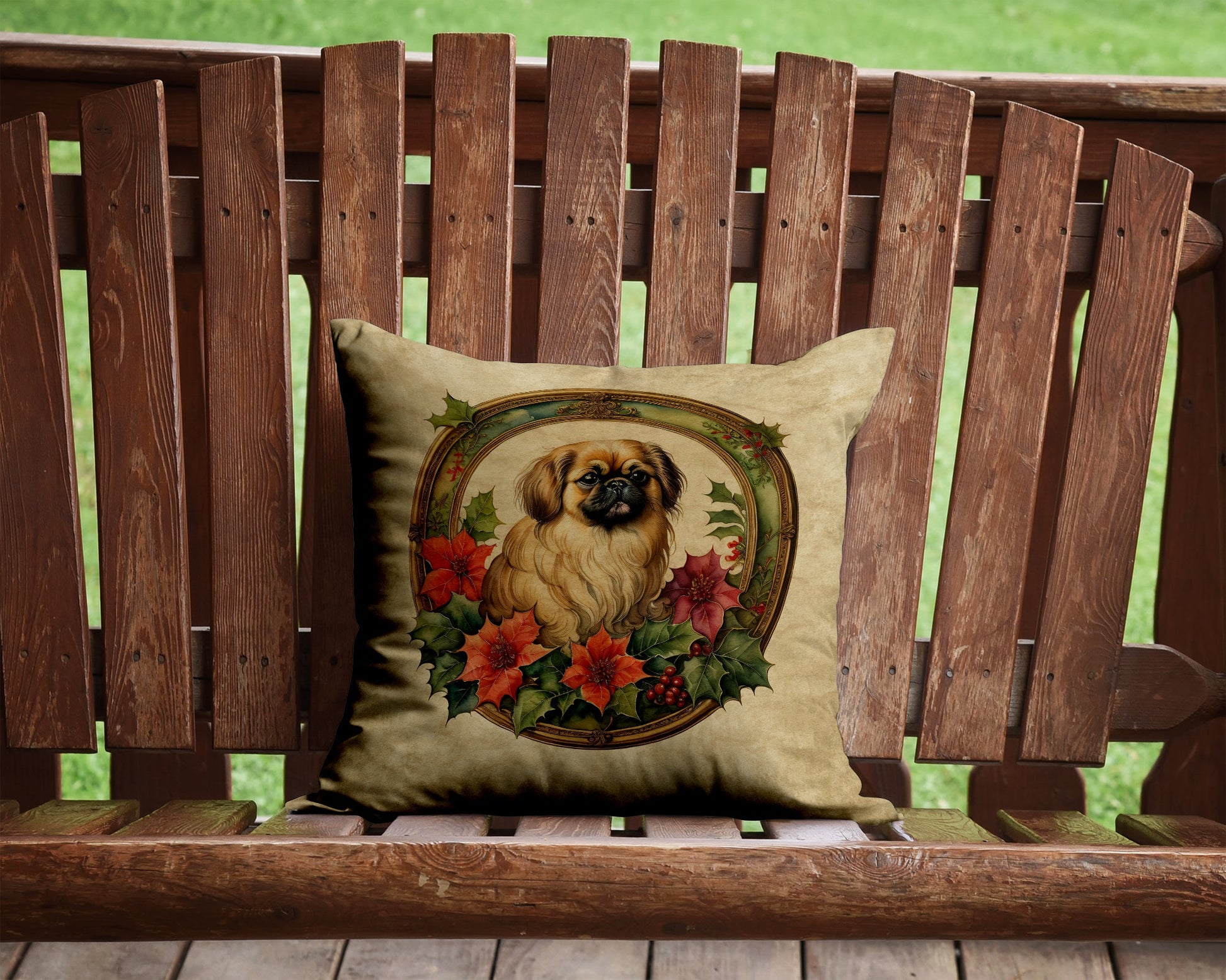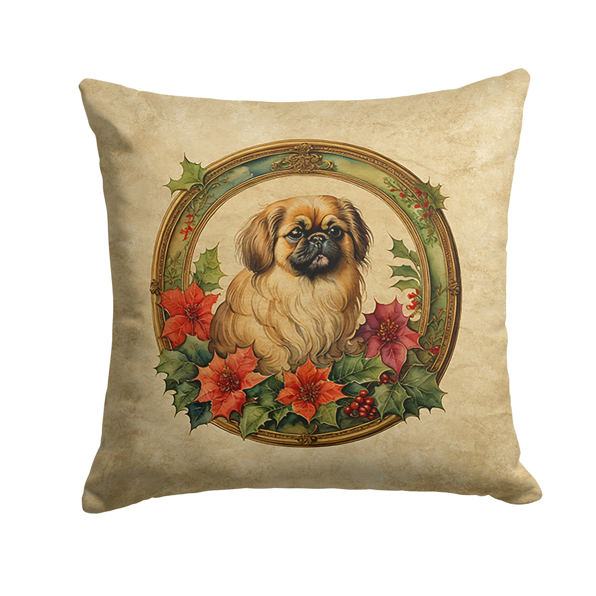 Throw Pillow featuring breed specific Pekingese artwork. Celebrate Christmas with this Christmas Pillow. Add a touch of vibrancy and comfort to your outdoor seating with Caroline's Treasures Fabric Decorative Pillow. Measuring approximately 14 inches by 14 inches, this outdoor pillow is crafted to elevate the appeal of your patio furniture, infusing it with vivid color and artistic flair. The pillow includes a 100% Polyester Fabric sham filled with a quality pillow form to provide superior comfort. Innovatively made from our brand new material, specifically woven for its water resistance, this pillow is designed for durability. The soft canvas fabric offers versatility in use, fit for your indoor couch or your outdoor patio, porch, or veranda. The fabric is dyed with colorfast dyes built for resilience against weather conditions, ensuring the pillow retains its beauty over time. Constructed by sewing three fabric pieces to create a sham, the polyester insert is then nestled inside to form the pillow, resulting in an overstuffed pillow that maintains its shape. Both the sham and the pillow insert are proudly made in the United States. As the pillows are handcrafted, there may be minor variations in size, further enhancing their unique charm. Experience comfort in style with Caroline's Treasures Fabric Decorative Pillow.